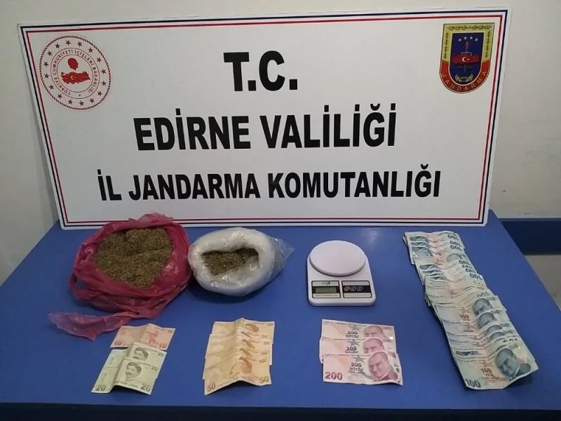 Edinilen bilgiye göre, Edirne İl Jandarma Komutanlığınca Keşan İlçe Jandarma Komutanlığı sorumluluk alanında bugün icra edilen yol kontrolü esnasında şüpheli bir araç durduruldu. Şüpheli, sürücü belgesini ibraz edememesi üzerine araçtan cezai işlem uygulanmak için indirildiği esnada cebinden peçeteye sarılı yaklaşık 4 gram ağırlığında uyuşturucu olduğu değerlendirilen ot şeklinde maddeyi yere attı. Bunun üzerine araçta yapılan aramada bin 194,50 gram uyuşturucu olduğu değerlendirilen madde, 4 bin 900 TL nakit para, 1 adet hassas terazi ele geçirildi. Araçta bulunan 3 şüpheli hakkında uyuşturucu madde imal ve ticareti suçundan adli tahkikat başlatılarak, gözaltına alındı.