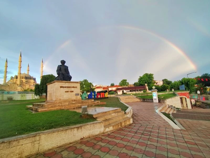 Meteoroloji Genel Müdürlüğünün uyarılarının ardından akşam saatlerinde başlayan sağanak yağış zaman zaman etkisini artırarak devam ediyor. Yağışın etkisini yitirdiği anda kent merkezinde oluşan gökkuşağı görenleri mest etti. Mimar Sinan’ın "ustalık eseri" Selimiye Camii çevresinde oluşan gökkuşağı görsel şölen oluşturdu. Bir ucu Selimiye Camisi’nin minarelerinde diğer ucu da şehir merkezine doğru uzanan gökkuşağının oluşturduğu renk cümbüşü, hayran bıraktı. Oldukça net görünen gökkuşağı doyumsuz bir görüntü ortaya çıkardı.