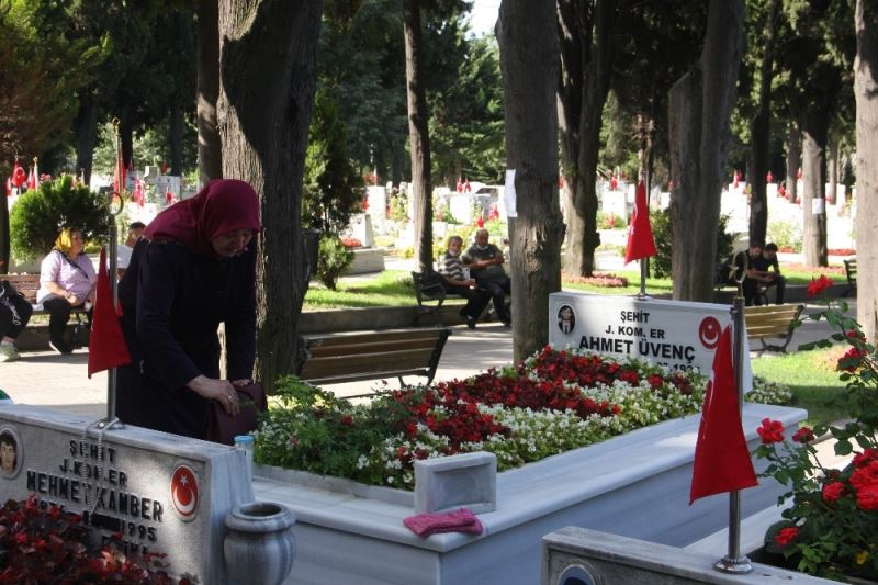 Her bayram olduğu gibi bu Kurban Bayramı’nın birinci gününde de şehit aileleri ve yakınları Edirnekapı Şehitliği’ni ziyarette bulundu. Edirnekapı Şehitliği’ne gelen şehit aileleri ve yakınları, mezarları temizleyerek çiçeklerini suladı. Şehit aileleri ve yakınları mezar başlarında Kur’an-ı Kerim ve dualar okudu. Buruk geçen kabir ziyaretlerinin olduğu Edirnekapı Şehitliği’nde megafondan şehitler için Kur’an-ı Kerim tilaveti verildiği görüldü.