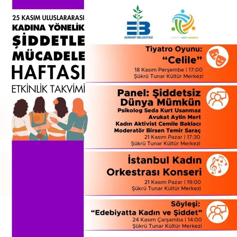 Etkinlikler, 17 Kasımda, Şiddetin Kökenleri konusunda bir söyleşi ile başlayacak, 18 Kasım’da Şükrü Tunar Kültür Merkezi’nde Saat 17.00’de Celile isimli tiyatro oyunu ücretsiz olarak gösterilecek, 21 Kasım’da avukat, psikolog ve kadın aktivistlerin katılacağı panel Şükrü Tunar Kültür Merkezi’nde saat 17.30’da düzenlenecek. 21 Kasım’da panel sonrası Şükrü Tunar Kültür Merkezi’nde Saat: 19.00’da Kadın Orkestrası konser verecek. 24 Kasım’da, Türk Edebiyatında Kadın temalı söyleşi yapılacak. Edremit Kent Konseyi Başkanı Birsen Temir Saraç, “Sadece kadınların değil, şiddete karşı kadınlar kadar toplumun tüm kesimlerinin, şiddete karşı bilinçlendirilmesi, farkındalığının arttırılması için Edremit Belediyesi ve Edremit Kent Konseyi birlikte şiddete dur demeye devam edeceğiz” dedi.