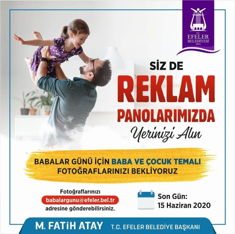 Efeler Belediyesi’nin sosyal medya hesaplarından yayımlanan duyuruda, “Siz de reklam panolarımızda yerinizi alın. Babalar Günü için ‘Baba ve Çocuk’ temalı fotoğraflarınızı bekliyoruz. Fotoğraflarınızı babalargunu@efeler.bel.tr adresine gönderebilirsiniz. Son Gün: 15 Haziran 2020” ifadelerine yer verildi.
