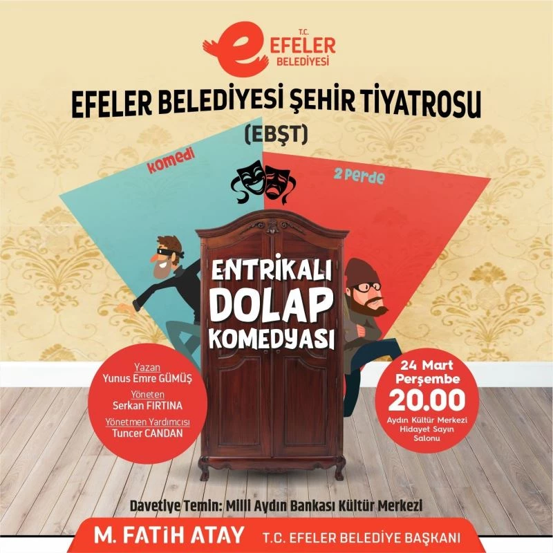 Efeler Belediye Başkanı Mehmet Fatih Atay’ın hayata geçmesine öncülük ettiği Efeler Belediyesi Şehir Tiyatrosu, kurulduğu günden bu yana gerçekleştirdiği sosyal sorumluluk çalışmaları ve sanat etkinlikleri ile kentin sanat hayatına renk katmaya devam ediyor. Dünya Tiyatro Günü dolayısıyla Efeler Belediyesi Şehir Tiyatrosu ekibinin hazırladığı ’Entrikalı Dolap Komedyası’ isimli oyun, 24 Mart Perşembe günü saat 20.00’de Aydın Kültür Merkezi Hidayet Sayın Sahnesi’nde Efelerli tiyatroseverlerle buluşmaya hazırlanıyor. Oyunun sınırlı sayıdaki biletleri, Milli Aydın Bankası Kültür Merkezi’nden ücretsiz temin edilebiliyor. Yunus Emre Gümüş’ün yazdığı, Efeler Belediyesi Şehir Tiyatrosu Genel Sanat Yönetmeni Serkan Fırtına’nın yönettiği iki perdelik komedi oyununda, şehir tiyatrosu eğitmenleri ve atölye öğrencileri birlikte rol alıyor.