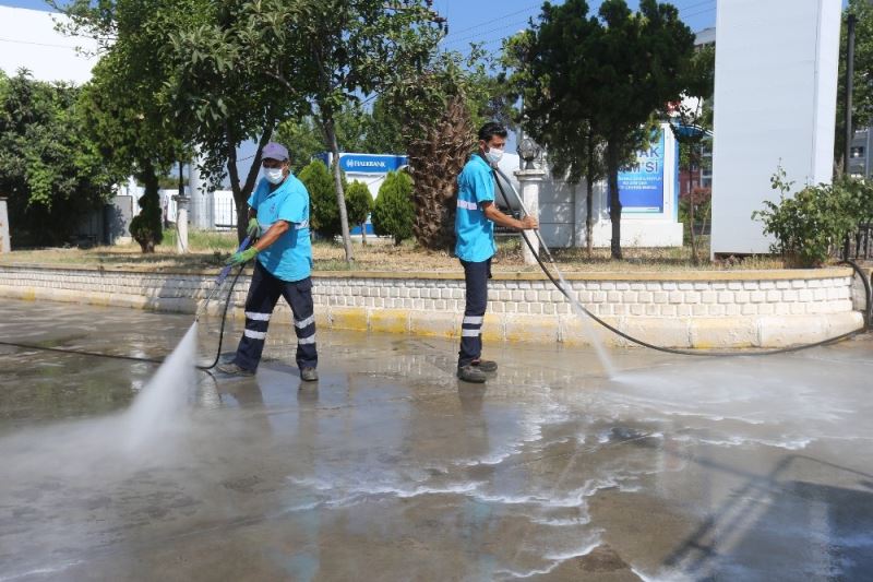 Çalışmalar için kolları sıvayan Efeler Belediyesi Temizlik İşleri Müdürlüğü’ne bağlı ekipler, temizlik araçları yardımıyla tazyikli ve köpüklü su kullanarak alanı köşe bucak temizledi. Normalleşme döneminde de sıkı koronavirüs tedbirleri alan Efeler Belediyesi çalışanları galericiler sitesini dezenfekte etmeyi de ihmal etmedi.