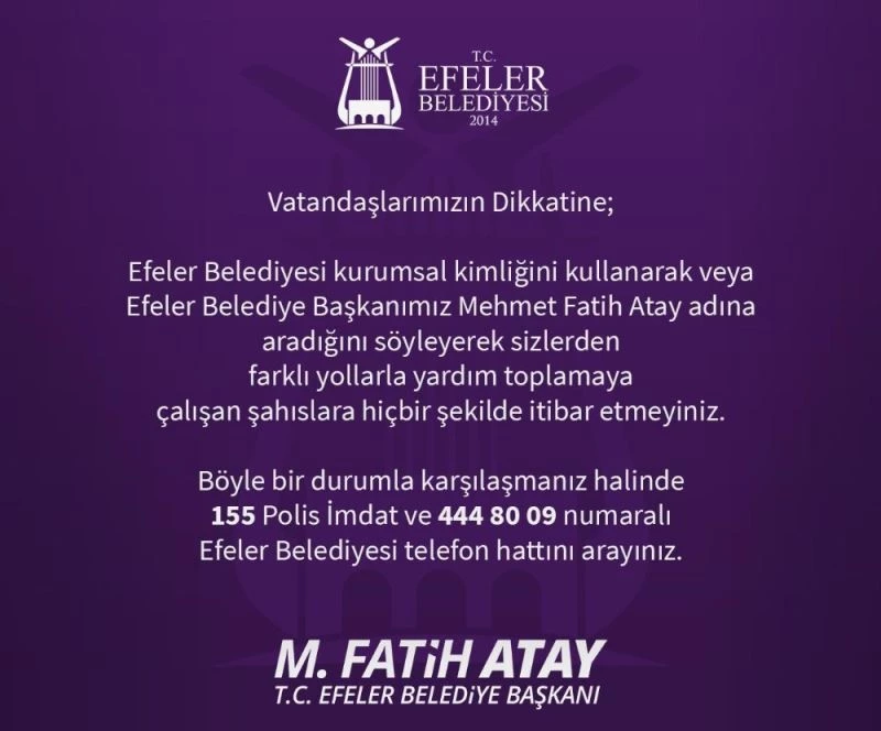 Efeler halkına SMS ile gönderilen uyarı metninde, “Vatandaşlarımızın Dikkatine; Efeler Belediyesi kurumsal kimliğini kullanarak veya Efeler Belediye Başkanı Mehmet Fatih Atay adına aradığını söyleyerek sizlerden farklı yollarla yardım toplamaya çalışan şahıslara hiçbir şekilde itibar etmeyiniz. Böyle bir durumla karşılaşmanız halinde 155 Polis İmdat ve 444 80 09 nolu Efeler Belediyesi telefon hattını arayınız” ifadelerine yer verildi.