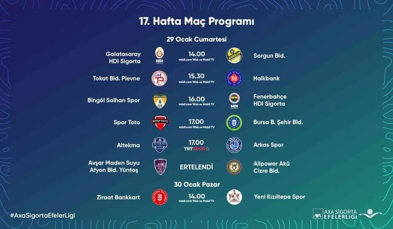 AXA Sigorta Efeler Ligi’nde 17. hafta yarın oynanacak 5 karşılaşmayla başlayacak.