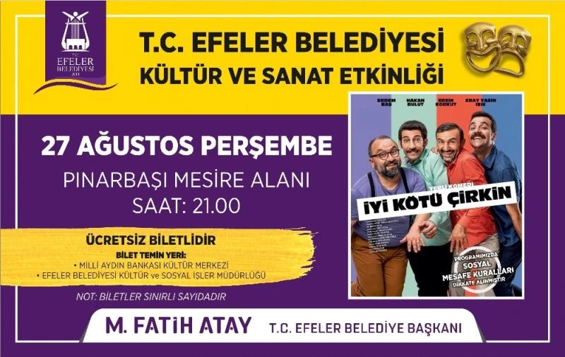 27 Ağustos Perşembe günü Pınarbaşı Mesire Alanı’nda, Eray Yasin Işık’ın yazdığı, Ahmet Burak Bacınoğlu yönetmenliğinde sahneye koyulan ’İyi Kötü Çirkin’ tiyatro oyunu saat 21.30’da Efelerli sanatseverlerle ücretsiz olarak buluşacak. Pandemi sebebiyle sınırlı sayıda izleyici alınacak olan Pınarbaşı Mesire Alanı’na girişler biletle gerçekleştirilecek. Efelerli vatandaşlar, sınırlı sayıda verilecek olan biletleri, Sevgiyolu’nda bulunan Efeler Belediyesi’ne ait Milli Aydın Bankası Kültür Merkezi’nden ve Efeler Belediyesi Kültür ve Sosyal İşler Müdürlüğü’nden temin edebilecekler.