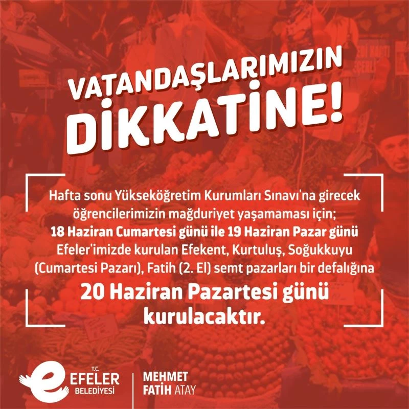 Semt pazarlarının okullara yakınlığı nedeniyle öğrencilerin ses, trafik yoğunluğu gibi herhangi bir olumsuzluk yaşamaması için tedbir alan Efeler Belediyesi, hafta sonu kurulan semt pazarlarının gününde değişikliğe gitti. Bu çerçevede Yükseköğretim Kurumları Sınavı (YKS) nedeniyle 18 Haziran Cumartesi günü ile 19 Haziran Pazar günü ilçede kurulan Efekent, Kurtuluş, Soğukkuyu (Cumartesi Pazarı), Fatih (2. El) semt pazarları bir defalığına 20 Haziran Pazartesi günü kurulacak.