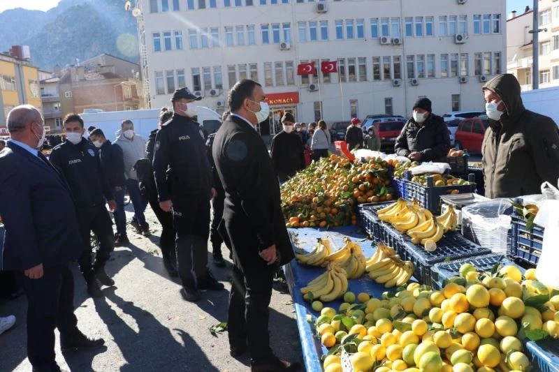 Kaymakam Adem Çelik koordinasyonunda, emniyet birimleri ve zabıta ekiplerinin de katılımıyla Eğirdir’de korona virüs salgın tedbirleri denetimleri 26 Kasım Perşembe günü de devam etti. Denetimlerde Kaymakam Çelik, pazar esnafını maske, mesafe ve temizlik konularında uyarmakla birlikte esnafın HES kodlarını kontrol etti ve görevlilere HES kodu ve sigara yasağı konularında titiz davranmaları talimatını verdi.