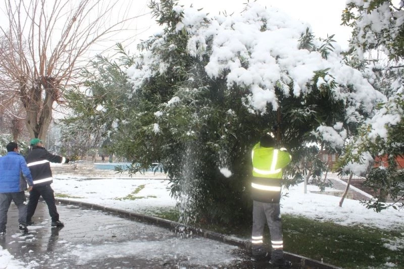 Park ve bahçelerde üzerinde kar birikintisi bulunan ağaçların zarar görmemesi için Adıyaman Belediyesi ekipleri seferber oldu.