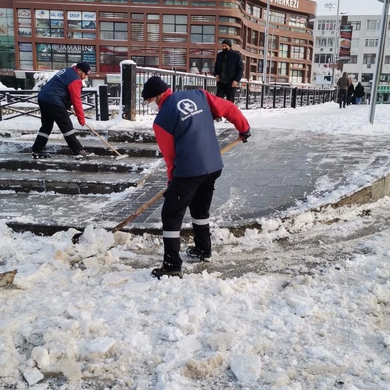 DÜZCE – Düzce’de geçtiğimiz hafta sonu etkili olan ve gece yarısı tekrar başlayan kar yağışı ile birlikte Düzce Belediyesi ekipleri sabaha kadar karla mücadele ederek, vatandaşların yürüyüş yollarını kullanıma açtı.