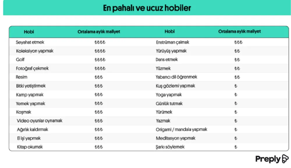 Hobiler her ne kadar pahalı gibi görünse de, bu alanda geniş seçenekler bulunuyor. Preply’nin en popüler hobi örnekleri araştırması, hobi seçimlerinin bütçeye göre şekillendirilebileceğini ve birçok hobi türünün düşük maliyetle yapılabileceğini gösteriyor. Örneğin; kitap okuma, günlük tutma, yoga, şarkı söyleme gibi aktiviteler neredeyse hiç harcama gerektirmeyen hobiler arasında yer alıyor. Diğer taraftan, seyahat, golf, koleksiyonculuk veya dalış gibi hobiler ise özel ekipman veya mekan gerekliliği dolayısıyla maliyetli hobi sınıfına giriyor.