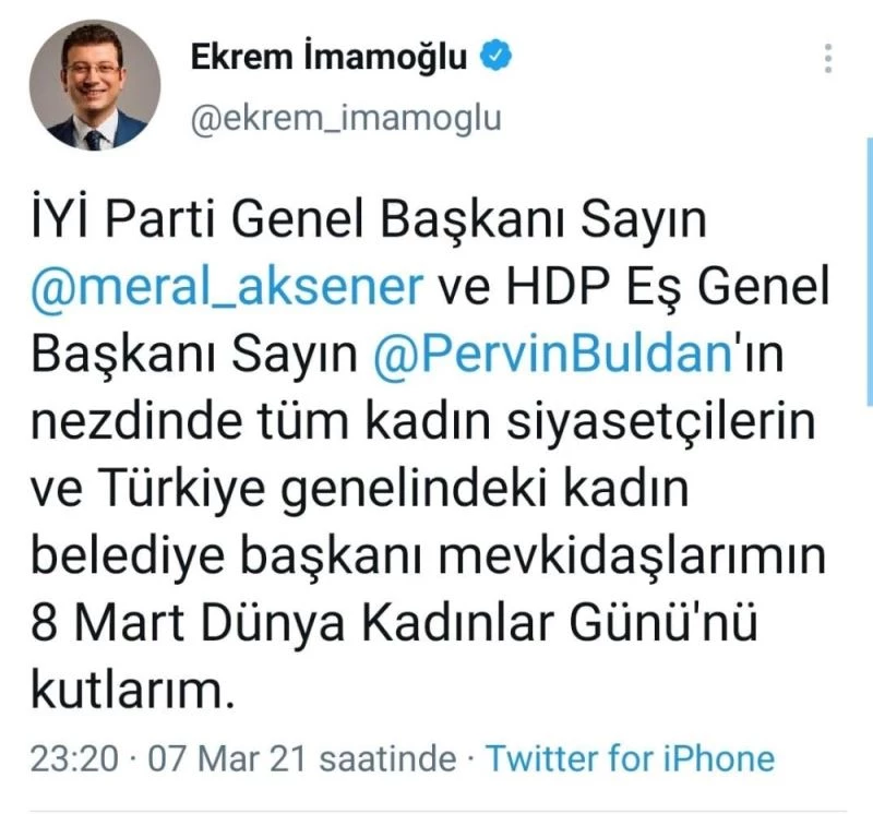 İBB Başkanı Ekrem İmamoğlu’nun sosyal medya sayfasında Kadınlar Günü paylaşımında HDP Eş Genel Başkanı Pervin Buldan’ı anması, şehit ve şehit ailelerinden hiç bahsetmemesi tepki topladı. İmamoğlu’na tepki gösteren sosyal medya kullanıcıları, İmamoğlu’nun paylaşımının altına Ordu Büyükşehir Belediye Başkanı Hilmi Güler’in “Başta şehit ve gazilerimizin eşleri ve anneleri olmak üzere, hayatımızın her anına dokunan, anlamlandıran ve güzelleştiren kadınlarımızın ‘8 Mart Dünya Kadınlar Günü’ kutlu olsun” paylaşımını örnek gösterdi.