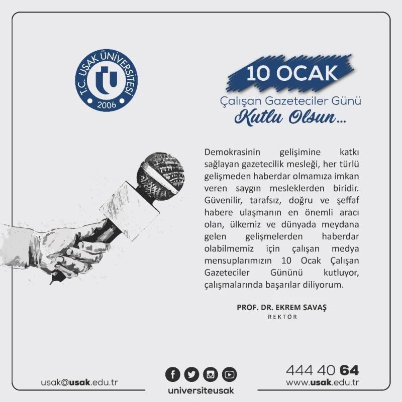 Uşak Üniversitesi Rektörü Prof. Dr. Ekrem Savaş, 10 Ocak Çalışan Gazeteciler Günü’nü kutladı.