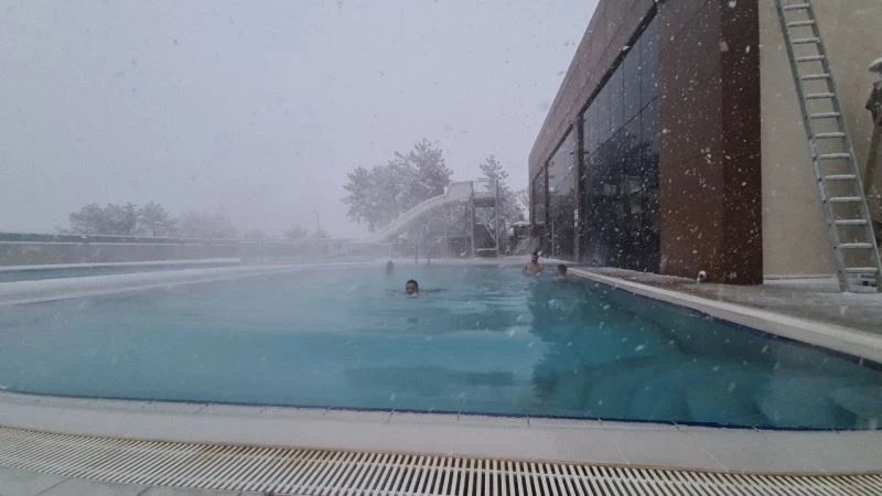 Uşak’ta yağan karı fırsat bilen vatandaşlar, eksi 16 derecede termal havuza giderek havuzun keyfini çıkardı.