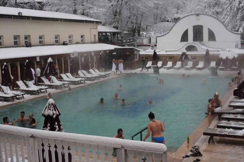 Kaplıcalarıyla ünlü Yalova’nın Termal ilçesini ziyaret eden turistler, eksi 3 derece sıcaklıkta termal havuzun keyfini doyasıya çıkarıyor.