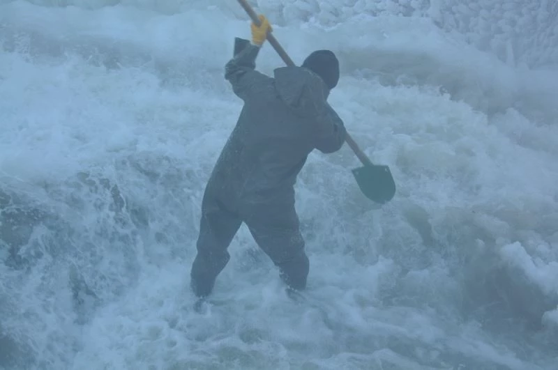 Dev buz kütlelerini kırmak için görevliler küreklerle çalışıyor. Çizme giyerek buzlu zemin üzerinde dondurucu soğuğa aldırış etmeden saatlerce çalışmak zorunda kalan görevliler suya düşmemek için yoğun mücadele veriyor.
