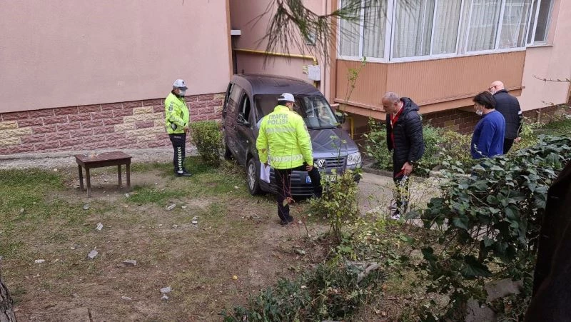 Karabük’ün Safranbolu ilçesinde sürücüsünün el frenini çekmeyi unuttuğu hafif ticari araç önce otomobile çarptı ardından sitenin bahçesine düştü.