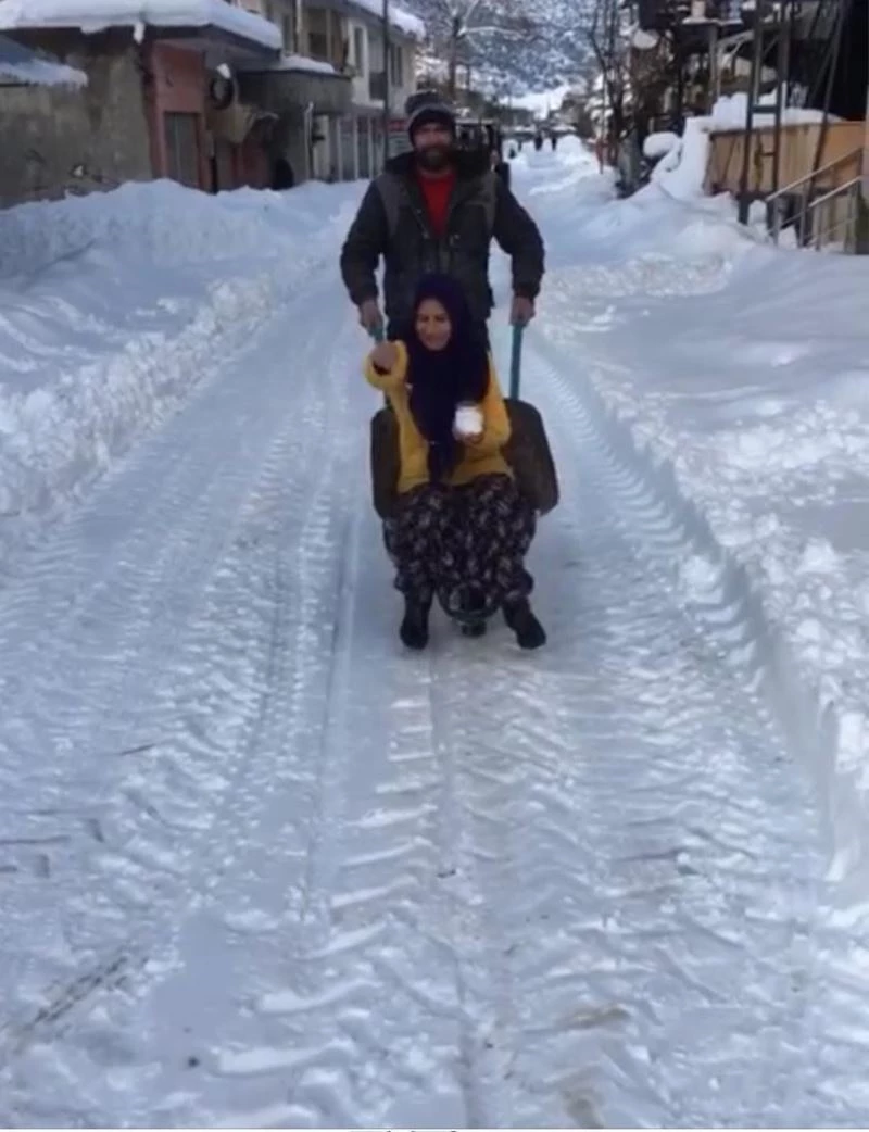 İlçeye bağlı Paşalı Mahallesi’nde Timur Kuzu isimli vatandaş, komşusu Özgül Açar’ı el arabasına bindirip, karlı yolda tuzlama yaptı. Video sosyal medyada da beğeni topladı. Mustafa Özsoy adlı vatandaşın da çocuklarla olan eğlencesi izleyenleri tebessüm ettirdi.