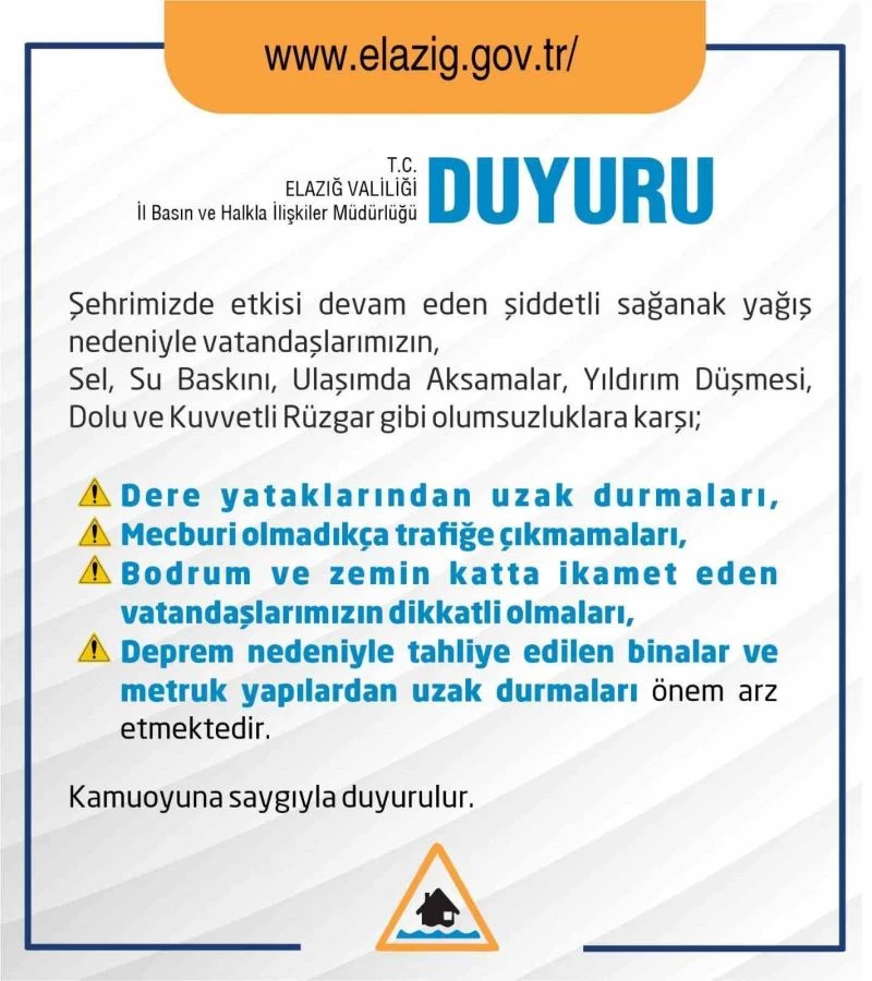 Elazığ Valiliği’nden yapılan açıklamada, “Şehrimizde etkisi devam eden şiddetli sağanak yağış nedeniyle vatandaşlarımızın, sel, su, baskını, ulaşımda aksamalar, yıldırım düşmesi, dolu ve kuvvetli rüzgar gibi olumsuzluklara karşı, dere yataklarından uzak durmaları, mecburi olmadıkça trafiğe çıkmamaları, bodrum ve zemin katta ikamet eden vatandaşlarımızın dikkatli olmaları, deprem nedeniyle tahliye edilen binalar ve metruk yapılardan uzak durmaları önem arz etmektedir” denildi.