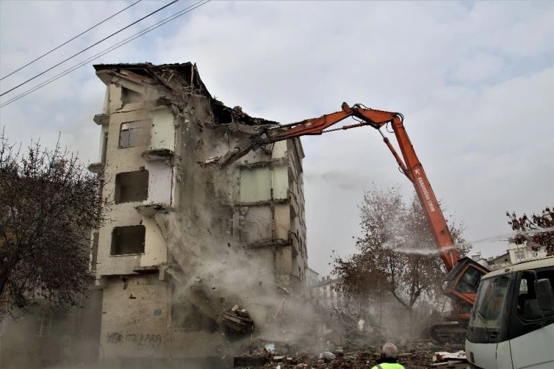 Elazığ’da 5.3’lük depremde ikinci kez hasar alan binanın kontrollü yıkımı başladı