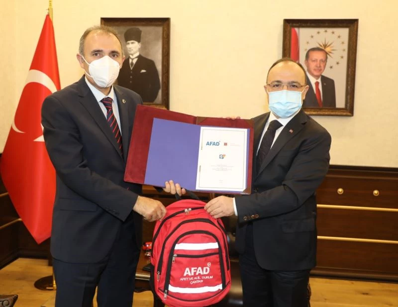 İçişleri Bakanlığı tarafından 2021 yılının “Türkiye Afet Eğitim Yılı” olarak ilan edilmesi kapsamında Elazığ Valiliği’nde Vali Erkaya Yırık ile FÜ Rektörü Prof. Dr. Fahrettin Göktaş, hazırlanan protokolü imzaladı. Protokol sonrasında İl AFAD Müdürü Osman Pıhtılı, Vali Yırık ile Rektör Göktaş’a afet ve acil durum çantası hediye etti.