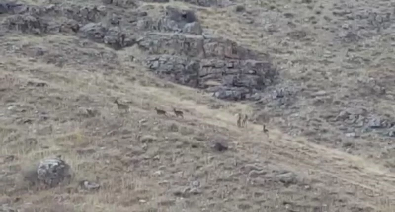 Sürü halinde yiyecek arayan dağ keçileri daha sonra hızla dağların zirvesine çıkarak gözlerden kayboldu.
