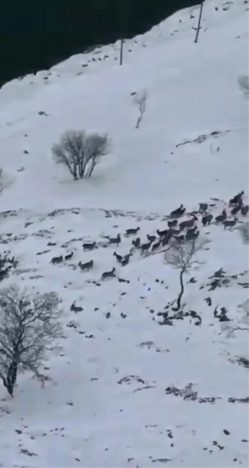 Elazığ’ın Karakoçan ilçesine bağlı Golan köyü mevkiinde dağ keçileri görüldü. O anlar ise yöre sakinlerinin cep telefonuna saniye saniye yansıdı. Karla kaplı arazide bir süre gezen sürü halindeki dağ keçileri daha sonra gözden kayboldu.