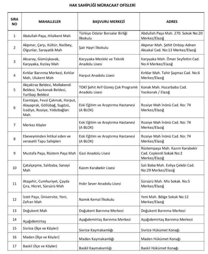 Kentte belirlenen okullar, geçici barınma merkezleri ile eski devlet hastanesinden oluşan 14 nokta ile Sivrice, Maden ve Baskil ilçeleri hükümet konaklarında oluşturulan toplam 17 müracaat ofisinde başvuru alınacağı kaydedildi.