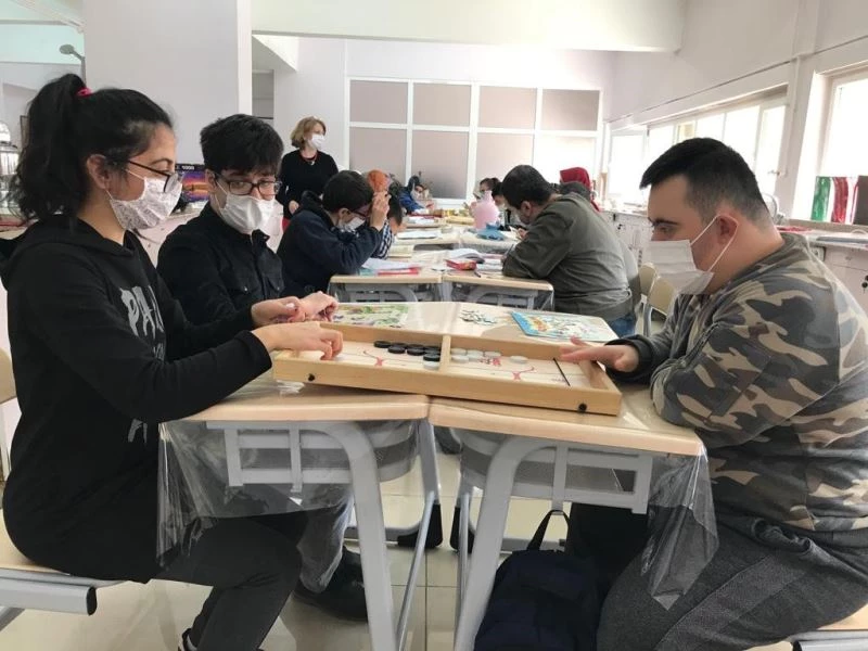 Elazığ Halk Eğitim Merkezi bünyesinde açılan el sanatları kursunda, hafif düzey engeli bulunan ve Down Sendromlu öğrenciler hem üretiyor hem de soysal aktivitelerini geliştirerek eğleniyor.