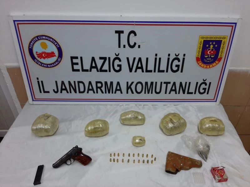 Elazığ İl Jandarma Komutanlığı Kaçakçılık ve Organize Şube Müdürlüğü ekipleri zehir tacirlerine yönelik operasyonlarına devam ediyor. Yapılan çalışmalar sonucunda jandarma ekipleri, Sivrice ilçesinde ikamet eden M.B. ve K.Ö. isimli şüphelilerin uyuşturucu madde ticareti yaptıkları bilgisini aldı. Şüphelilerin evine düzenlenen operasyonda K.Ö. isimli şahsın evinde 5 kilo 150 gram gram kubar esrar maddesi, şüpheli M.B.’nin evinde 1 adet 7.65 milimetre çapında ruhsatsız tabanca ve 21 adet fişek ele geçirildi. Gözaltına alınan şüpheliler İl Jandarma Komutanlığında ifadelerinin alınmasının ardından uyuşturucu madde imal ve ticareti, kullanmak için uyuşturucu veya uyarıcı madde satın almak ve kabul etmek veya bulundurmak suçlarından yasal işlem başlatıldı.