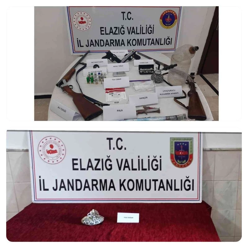 Elazığ’da İl Jandarma Komutanlığı ekiplerinin zehir tacirlerine yönelik yaptıkları istihbari çalışmaları sonucunda son bir hafta içerisinde 16 operasyon gerçekleştirilerek 24 şüpheli hakkında yasal işlem başlatıldı. Jandarma ekiplerince yapılan operasyonlar sonucunda 500 gram esrar, 40 gram metamfetamin, 5 gram eroin, 5 adet sentetik hap, 2 adet ruhsatsız av tüfeği, 2 adet faturasız kurusıkı tabanca, 14 adet av tüfeği fişeği, 2 adet kurusıkı tabanca fişeği, 4 adet uyuşturucu içme aparatı, 1 adet hassas terazi, 1 adet pala, 1 adet hançer ele geçirildi.