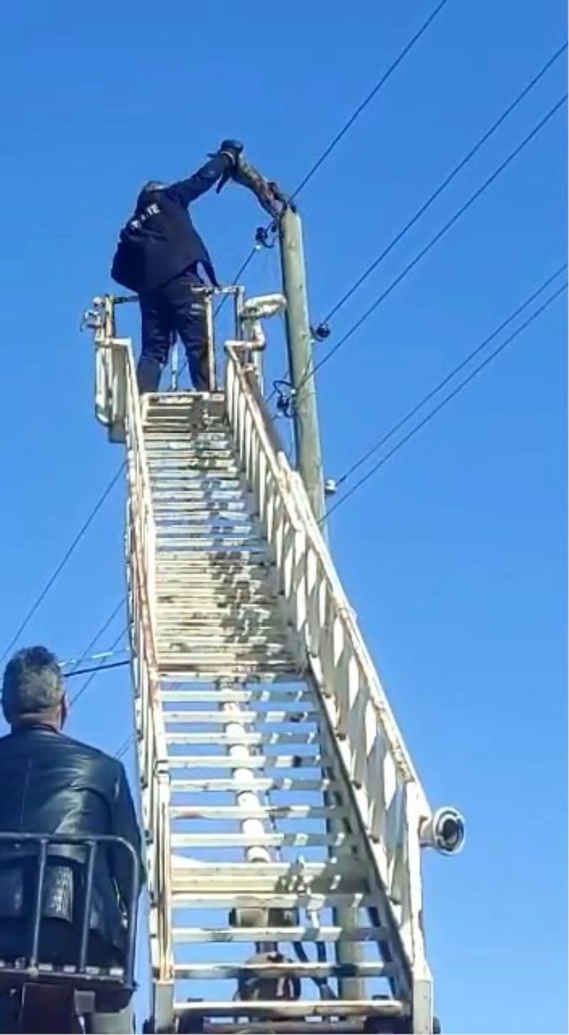 Edinilen bilgiye göre, Yurtbaşı beldesinde elektrik direğinin tepesinde bir kedinin sesini duyan ve inemediğini gören vatandaşlar durumu itfaiye ekiplerine bildirdi. Bölgeye sevk edilen itfaiye ekipleri, elektrik direğine uzatılan merdivenle kediyi bulunduğu yerden kurtardı.