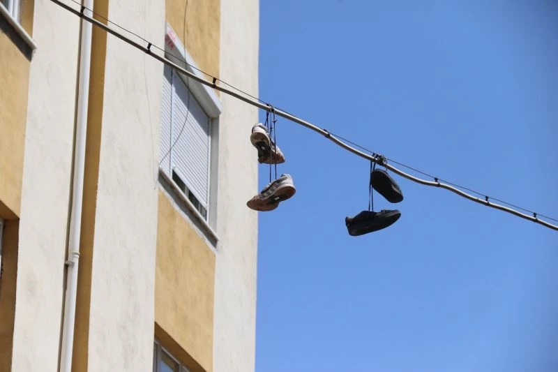 Eskişehir’in Şirintepe mahallesinde elektrik direği ve bina arasındaki bağlantıyı sağlayan kabloya atılan 2 çift ayakkabı görenleri hayrete düşürüyor.