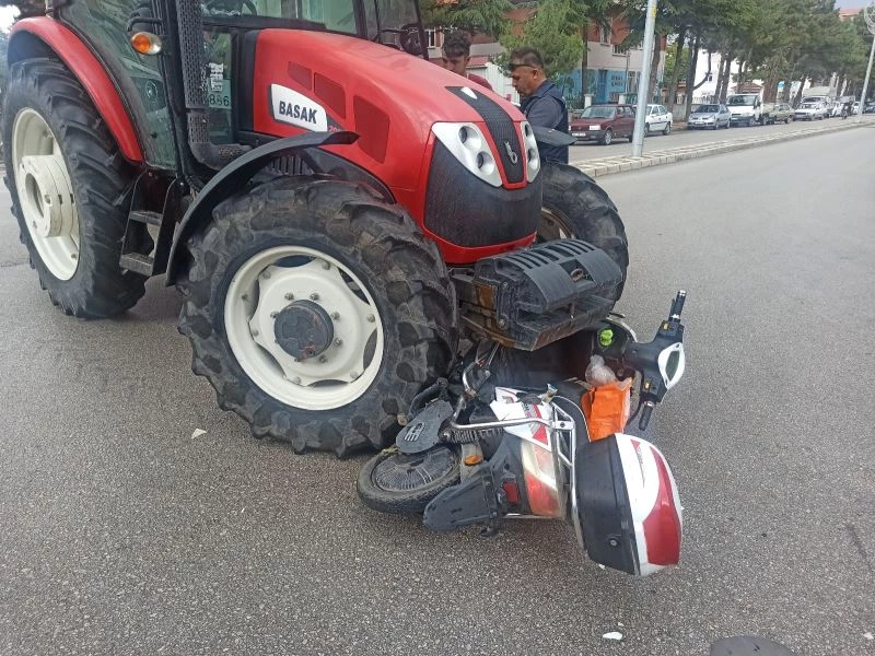 E.D., isimli kadının kullandığı tescilsiz elektrikli bisiklete çarptı. Çarpmanın etkisi ile kadın araçtan düşerken, elektrikli bisiklet ise traktörün ön lastiklerinin altında kaldı. Çevredekiler haber vermesi ile olay yerine gelen polis ekipleri yaptıkları incelemede, traktör sürücüsünün 17 yaşında olduğunu ve ehliyetinin olmadığını belirledi. Kazanın etkisi ile şoka giren ve bir süre konuşmayan E.D.’yi çevredeki esnaflar sakinleştirmeye çalıştı. Bacağında ağrılar olan E.D., ilk başta ambulans teklifini reddederken sonrasında ise polis ekiplerinin ısrarı ile ekip aracına binerek Şuhut Devlet Hastanesi’ne gitti.