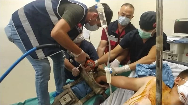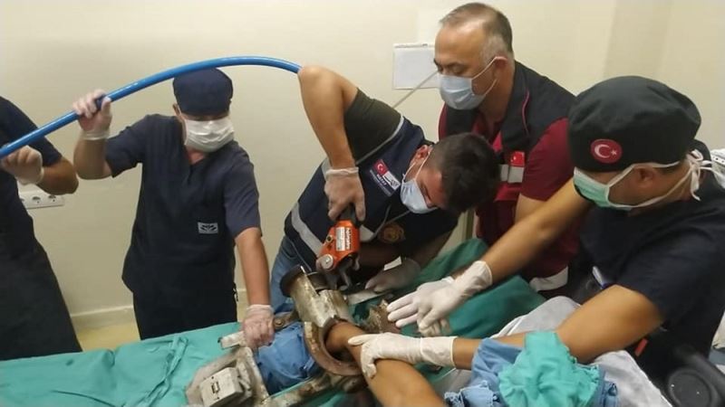 Yaralı gencin el ve parmaklarını, sıkıştığı yerden kurtarmak için Hatay Büyükşehir Belediyesi Dörtyol İtfaiye Amirliği ekiplerinden yardım istendi.