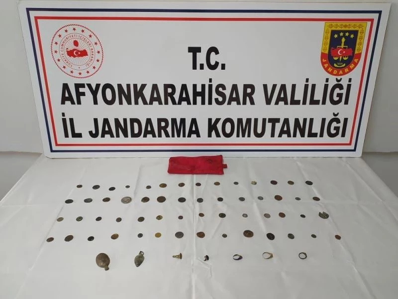 Afyonkarahisar İl Jandarma Komutanlığı ekiplerince Emirdağ ilçesi Güveççi köyünde ikamet eden şüpheli Y.K. isimli şahsın elinde tarihi eser bulunduğu ve bu eşyaları Bolvadin ilçesi Dişli beldesinde satmak için müşteri aradığı yönünde istihbari bilgi alındı. Edinilen bilgiler doğrultusunda, Bolvadin ilçesine bağlı Dişli beldesinde icra edilen yol kontrol ve arama faaliyetinde Y.K. isimli şahıs, M.Ö. isimli şahıs ile bir araçta yakalandı. Şahısların yapılan üst aramasında ve araç içinde; 56 sikke, 4 adet yüzük, 1 adet mühür, 1 adet kolye ucu ve 1 adet tarihi obje ele geçirildi. Y.K. ve M.Ö. isimli şahıslar hakkında adli tahkikata başlanıldığı bildirildi.