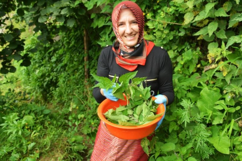 Ordu’da ev hanımı elleri yan yana ısırgan otu toplayarak kendisine ekonomik kazanç elde ediyor.