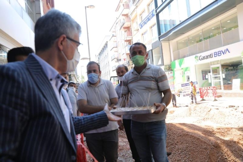 Ellibeş, daha sonra İSU çalışanlarına bir tepsi baklava ikram etti. Süreç boyunca bölge esnafının yanında olmaya devam edeceklerini kaydetti.