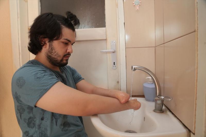 Dulkadiroglu ilçesi Erkenez Mahallesi'nde yasayan 24 yasindaki Sahan, elleri ve ayaklari olmadan dünyaya geldi.