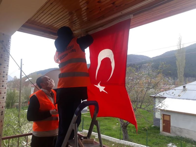 Ekipler, ilçe merkezine yaklasik 25 kilometre uzaktaki Çokak Mahallesi'nde yasayan Kamil ve esi Gülsüm Yilmaz'i ziyaret ederek, Türk bayragini teslim etti.