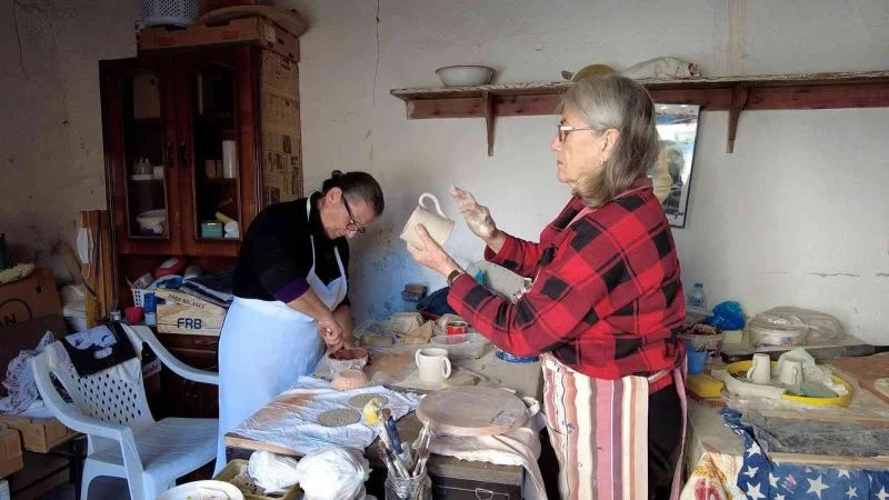 Foça ilçesi Bağarası Mahallesi’nde emekli öğretmenler Nuraydın Kurtul ve Leyla Buhara, emekliliği evde oturarak geçirmek istemedi. Yolları emekli olduktan sonra kesişen ve seramik sanatına merak saran iki kadın, bir atölyede çalışmalara başladı.