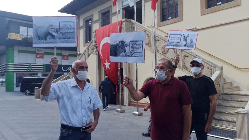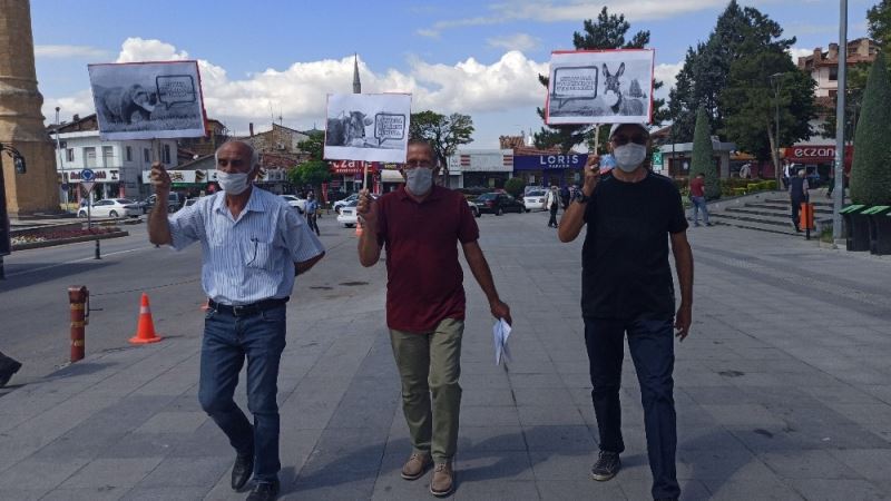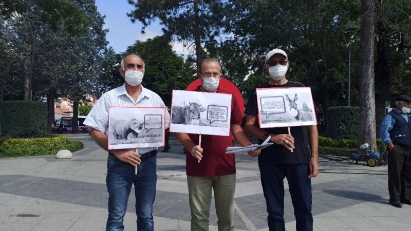 Hürriyet ve Gazi caddesinde ellerinde maske takan inek, ayı ve eşek resimlerinin bulunduğu dövizleri taşıyan emekli öğretmenler Ekrem Özümar ile Suat Karakeçili ve Mustafa Velidedeoğlu, vatandaşlara maske kullanmaları için çağrıda bulunarak kurallara uyulmasını istediler.