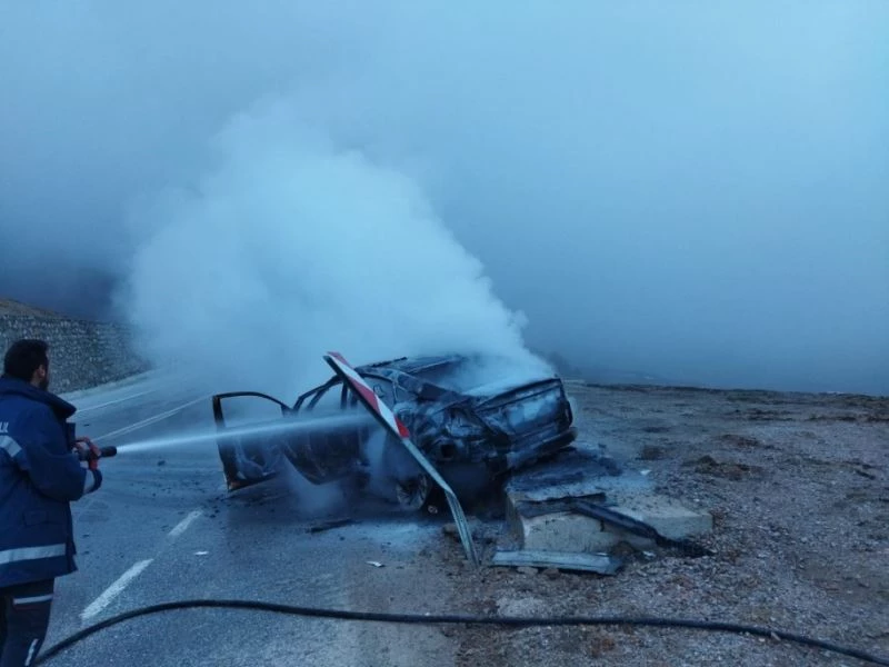 Kütahya’nın Emet ilçesinde sürücüsünün direksiyon hakimiyetini kaybettiği araç bariyerlere çarparak alev alev yandı.