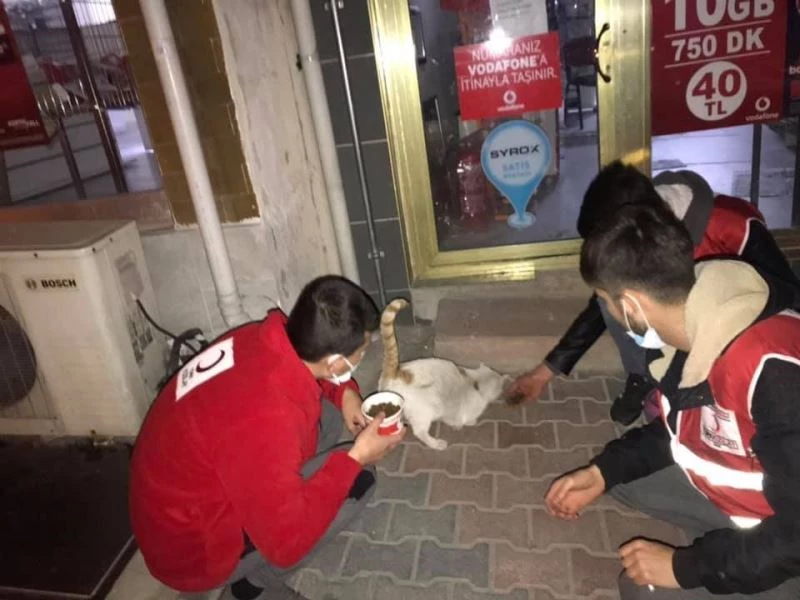 Kütahya’nın Emet ilçesinde yanlarına aldıkları kedi ve köpek mamalarıyla ilçeyi dolaşan Kızılay gönüllüleri besleme yaptı.