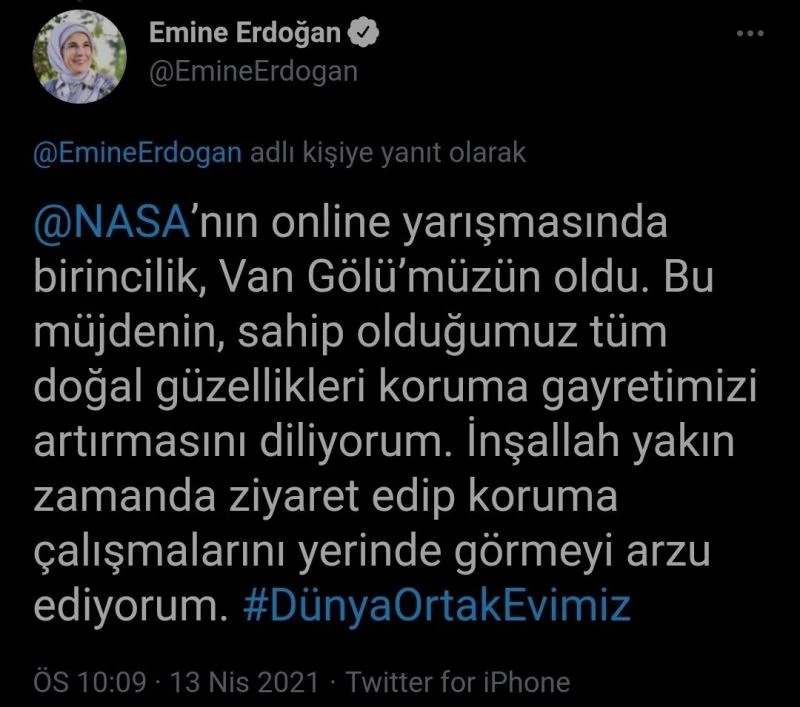 Daha önce finalist Van Gölü fotoğrafı için destek çağrısında bulunan Cumhurbaşkanı Erdoğan’ın eşi Emine Erdoğan, bu kez Twitter hesabından ikinci bir paylaşım daha yaptı. Erdoğan, "NASA’nın online yarışmasında birincilik, Van Gölü’müzün oldu. Bu müjdenin, sahip olduğumuz tüm doğal güzellikleri koruma gayretimizi artırmasını diliyorum. İnşallah yakın zamanda ziyaret edip koruma çalışmalarını yerinde görmeyi arzu ediyorum. #DünyaOrtakEvimiz" ifadelerini kullandı.