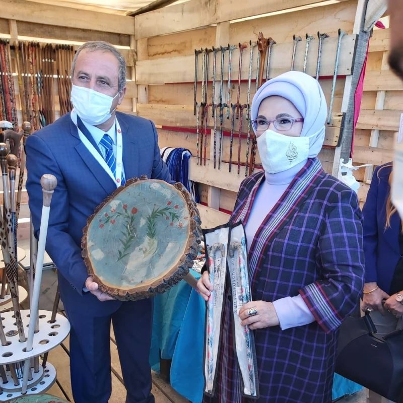 Malazgirt Zaferi’nin 949. yıldönümü kutlamalarına katılmak üzere Bitlis’in Ahlat ilçesine gelen Cumhurbaşkanı Recep Tayyip Erdoğan’ın eşi Emine Erdoğan, ’1071 Sultan Alparslan Ahlat Otağı’nda el sanatları alanını ziyaret etti. El sanatları alanında meşhur Adilcevaz ceviz ağaçlarından yapılan Adilcevaz Bastonu standını ziyaret eden Erdoğan, bastonlara ve ebru sanatıyla geri dönüşüm malzemeleri ile yapılan ürünlere ilgi gösterdi. Baston ustası Cumali Birol tarafından atık malzemelerin geri dönüşüme kazandırılması amacıyla yapılan ürünleri hayranlıkla inceleyen Emine Erdoğan, en yakın zamanda atölyesini ziyaret etmek istediğini söyledi. Baston ustası Cumali Birol da ziyaretleri anısına Emine Erdoğan’a atık boynuzdan kalemlik, ceviz ağacı kütüğünden ebru işlemeli sehpa ve ebru işlemeli küçük bastonlar hediye etti.