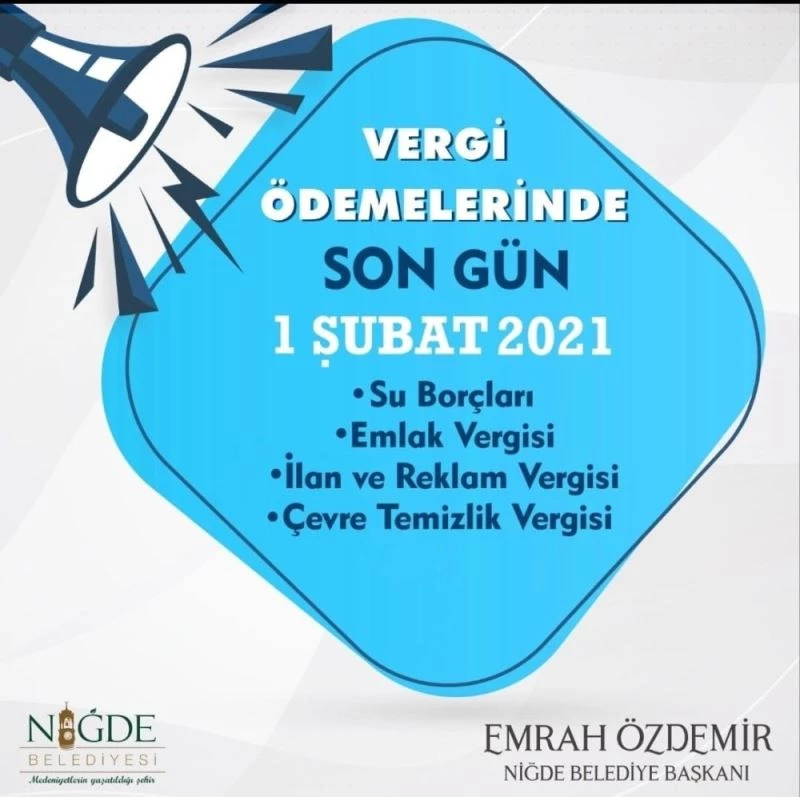 Niğde Belediyesi Mali Hizmetler Müdürlüğü, vatandaşların vergi ödemesinde yapılandırma yaparak mağdur olmamaları için Emlak, İlan Reklam Tabela ve Çevre Temizlik vergilerinin, su borçlarının 1 Şubat 2021 tarihinde biteceğini bildirdi.