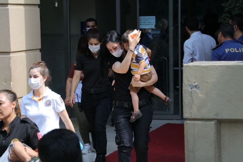 Kendilerini evden atmak isteyen emlakçıyı dava etmek için adliyeye gelen anne babalarının yanında bulunan M. (5) ile kardeşi Y. (3) ve 1 kişi de yaşanan arbede sırasında başlarına demir sopa ile aldıkları darbelerle yaralandı.