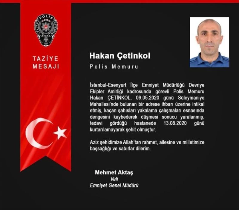 Emniyet Genel Müdürlüğü’nün sosyal medya hesabından yayımlanan Aktaş’ın mesajında, “İstanbul-Esenyurt ilçe Emniyet Müdürlüğü Devriye Ekipler Amirliği kadrosunda görevli polis memuru Hasan Çetinkol, 9 Mayıs 2020 tarihinde Süleymaniye Mahallesi’nde bulunan bir adrese ihbarı üzerine intikal etmiş, kaçan şahısları yakalama çalışmaları esnasında dengesini kaybederek düşmesi sonucu yaralanmış, tedavi gördüğü hastanede 13 Ağustos günü kurtarılamayarak şehit olmuştur.