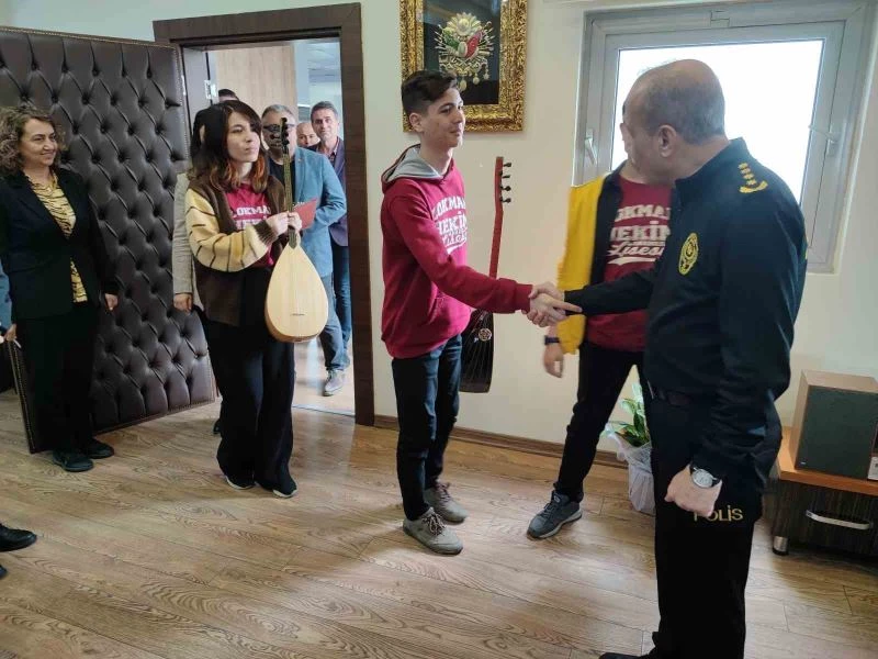 Adana Emniyet Müdürlüğünün “Sevgiyle Büyüyoruz” projesi çerçevesinde bağlama kursuna katılan öğrenciler polis haftası çerçevesinde Emniyet Müdürü Doğan İnci’yi makamında ziyaret ederek sazlı sözlü kutlama yaptı.